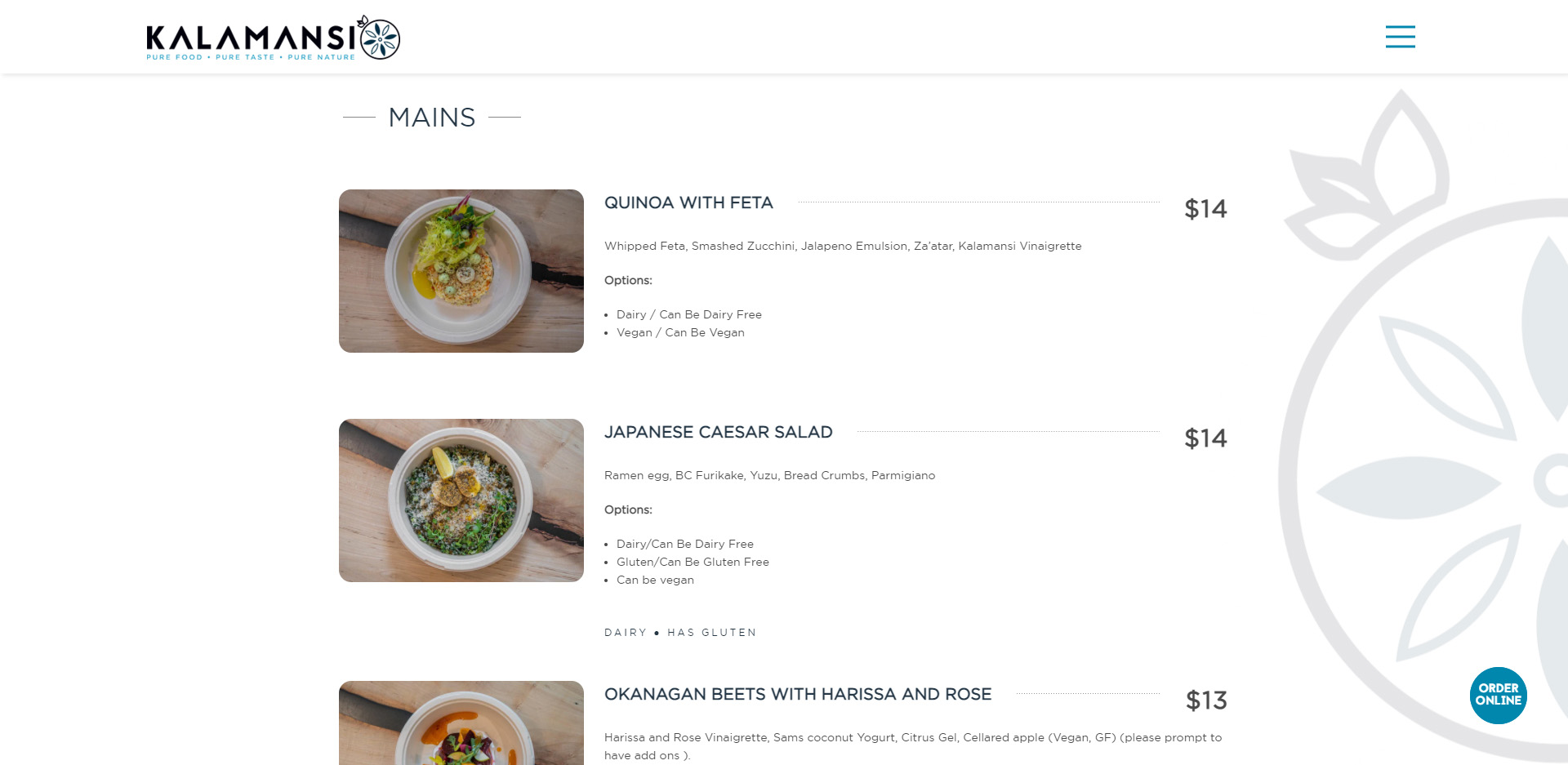 We envision a simple, clean look for this site. Our food is inspired by the real ingredients that surround us and we want a design and site that reflects that. We see a white design with our logo in the centre of the top of page. The homepage would have strong imagery which would highlight some of the featured dishes as well as imagery that would represent the brand and suppliers for the ingredients.